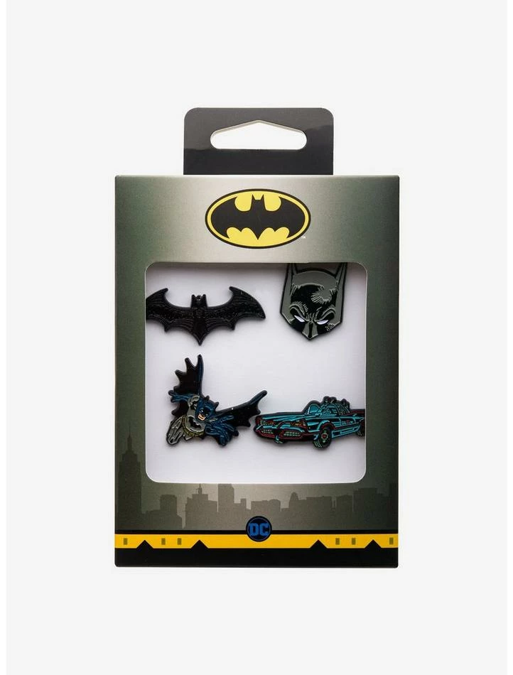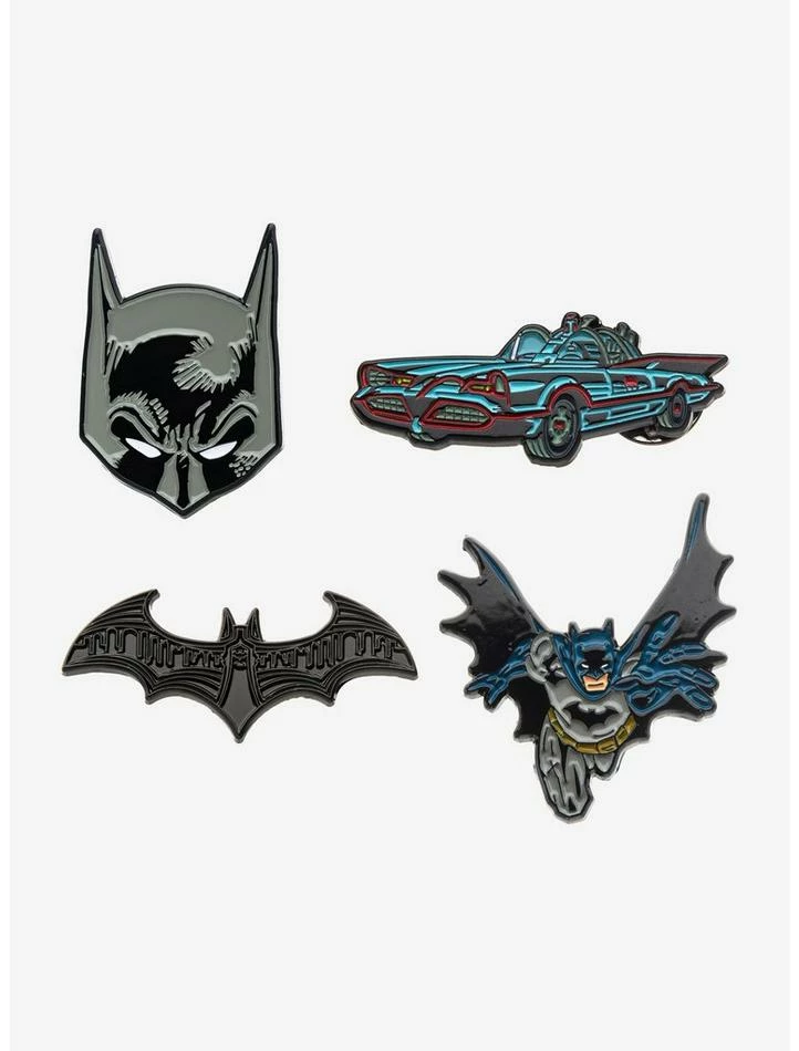 Four piece Batman Enamel Pin set. Licensed jewelry packaging included.