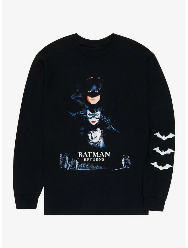 Become a creature of the night and protect the city of Gotham from The Penguin in this Batman Returns tee! Featuring Batman, Catwoman and The Penguin on the front, plus bat silhouettes down the left sleeve.