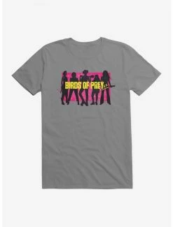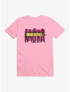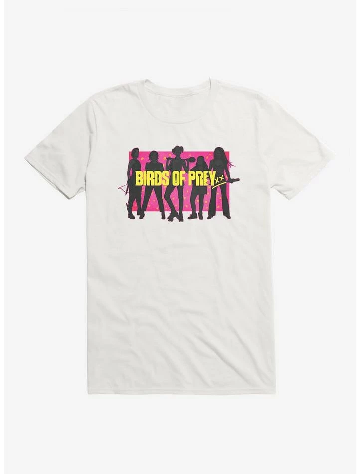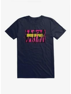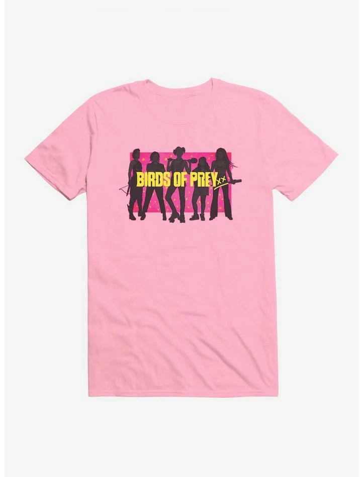 Girl gang goals. Inspired by Birds of Prey, this lightweight black tee features a neon box with Harley Quinn and her crew – Helena Bertinelli, Renee Montoya, Cassandra Cain and Dinah Lance – in silhouette.