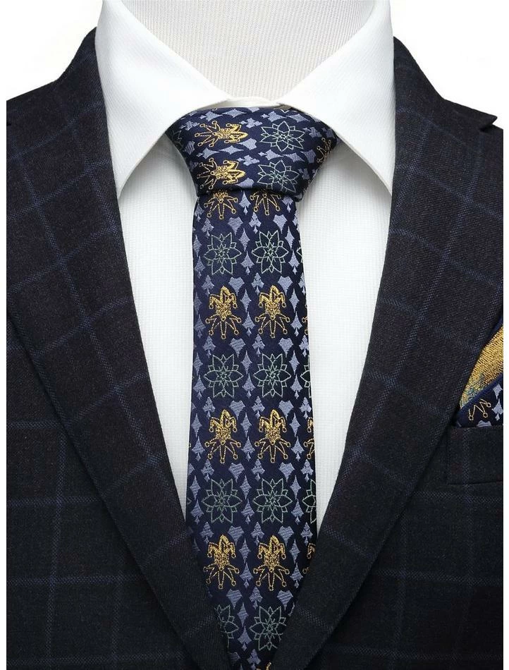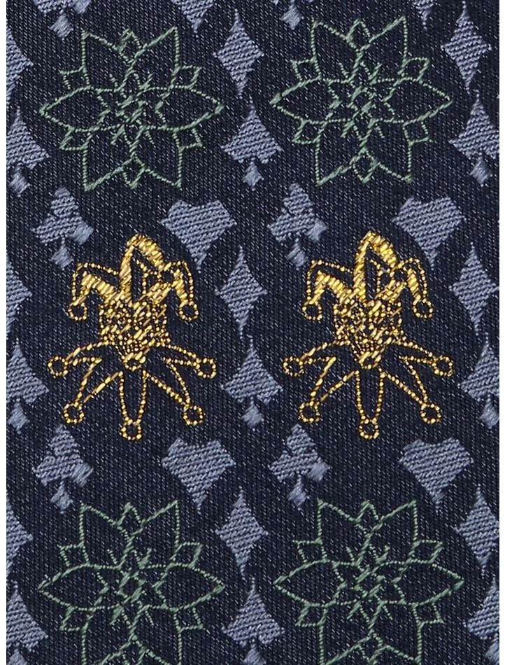 Make a statement in this dramatic Joker-themed 100% silk slim tie. Metallic gold threads have been carefully woven together with pale green and blues to form The Joker’s emblem alongside a series of his acid-spewing lapel flowers. Look carefully and you’ll also see the symbols of a deck of cards scattered throughout. Officially licensed by DC Comics. Approximately 59″ x 3″, 100% silk.