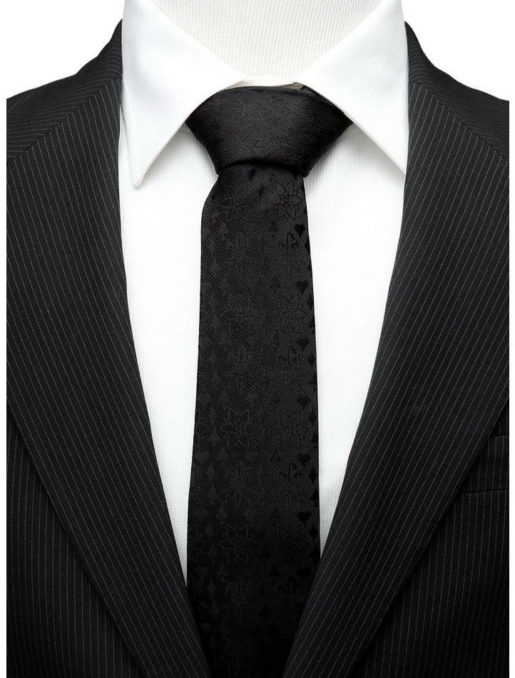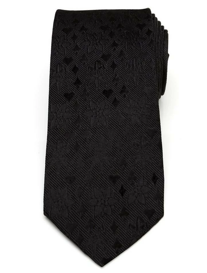 What appears at first to be a plain black tie, is actually discretely decorated with the emblem of The Joker alongside a series of his acid-spewing lapel flowers. This 100% silk slim tie also features the Batman logo on the reverse. Officially licensed by DC Comics. Approximately 59″ x 3″, 100% silk.