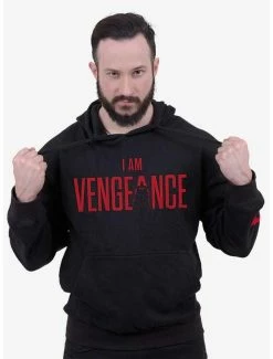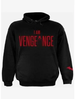 Official licensed product from the DC Universe. With a powerful profile shot of The Batman beneath the heavy Gotham rain, this design is further enhanced by the iconic words I Am Vengeance in red on the reverse print. This hoodie is made of cotton fleece using skin friendly, Azo-free, reactive dyes.